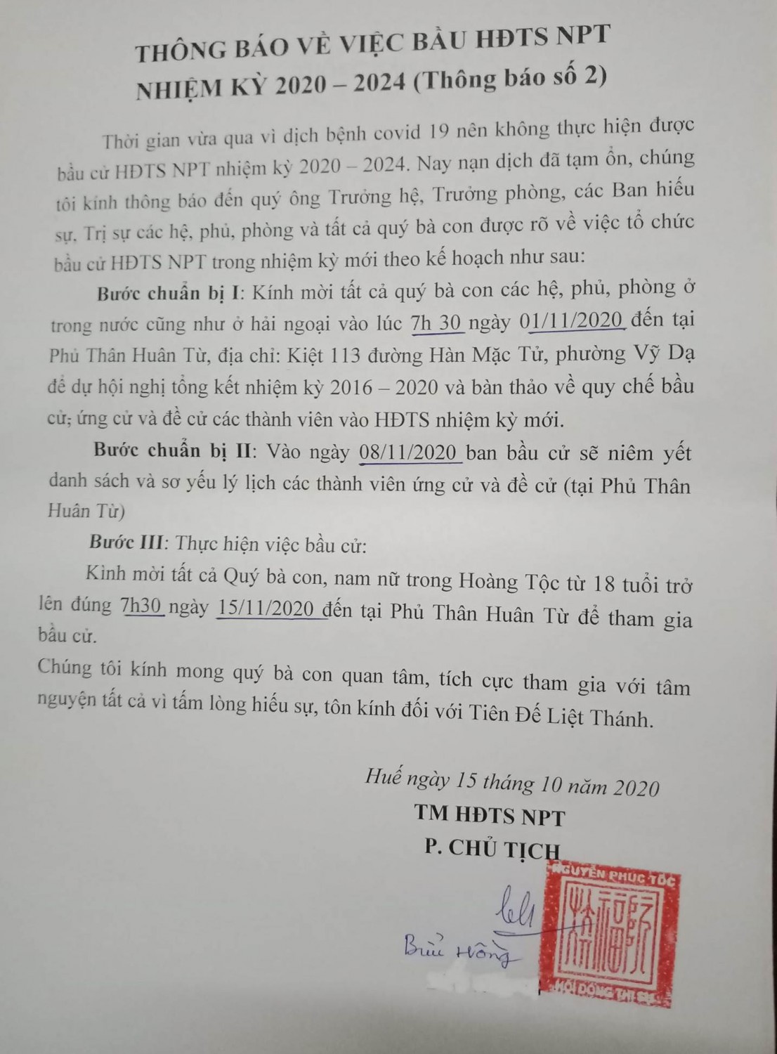 - Bước chuẩn bị I: Kính mời quý bà con các hệ, phủ, phòng ở trong nước cũng như ở hải ngoại vào lúc 7:30 ngày 01/11/2020 đến tại phủ Thán Huân Từ, địa chỉ: Kiệt 113 đường Hàn Mạc Tử, phường Vỹ Dạ để dự hội nghị tổng kết nhiệm kỳ 2016-2020 và bàn thảo qui chế bầu cử, ứng cử và đề cử các thành viên vào HĐTS nhiệm kỳ mới.